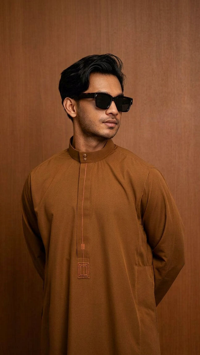 For the man who shows up sharp, no matter the occasion. A premium mens thobe that moves with your day. Cool enough for the afternoon heat. Detailed enough to turn heads by evening. The heavy embroidery speaks for itself, no need to try too hard when the craftsmanship does the talking. Moroccan design. Built for real life. From Friday prayers to family gatherings, this is the thobe you keep coming back to.
